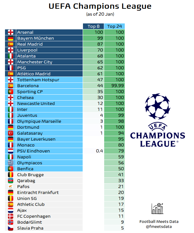 Op basis van alle mogelijke scenario’s, resterende wedstrijden en onderlinge afhankelijkheden wordt de kans dat Ajax de top 24 van de Champions League haalt momenteel geschat op 15%.